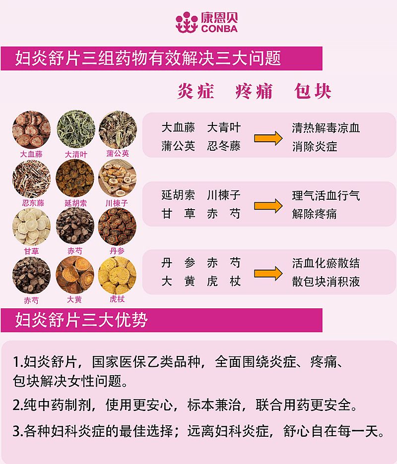 | 功能主治 | 清熱涼血,活血止痛。用于婦女濕熱下注所致的帶下量多、小腹隱痛,也常用于盆腔炎、附件炎、子宮內膜炎、宮頸炎、陰道炎等婦科炎癥引起的癥狀,如白帶異常、下腹脹痛、異味、尿頻尿急等 |